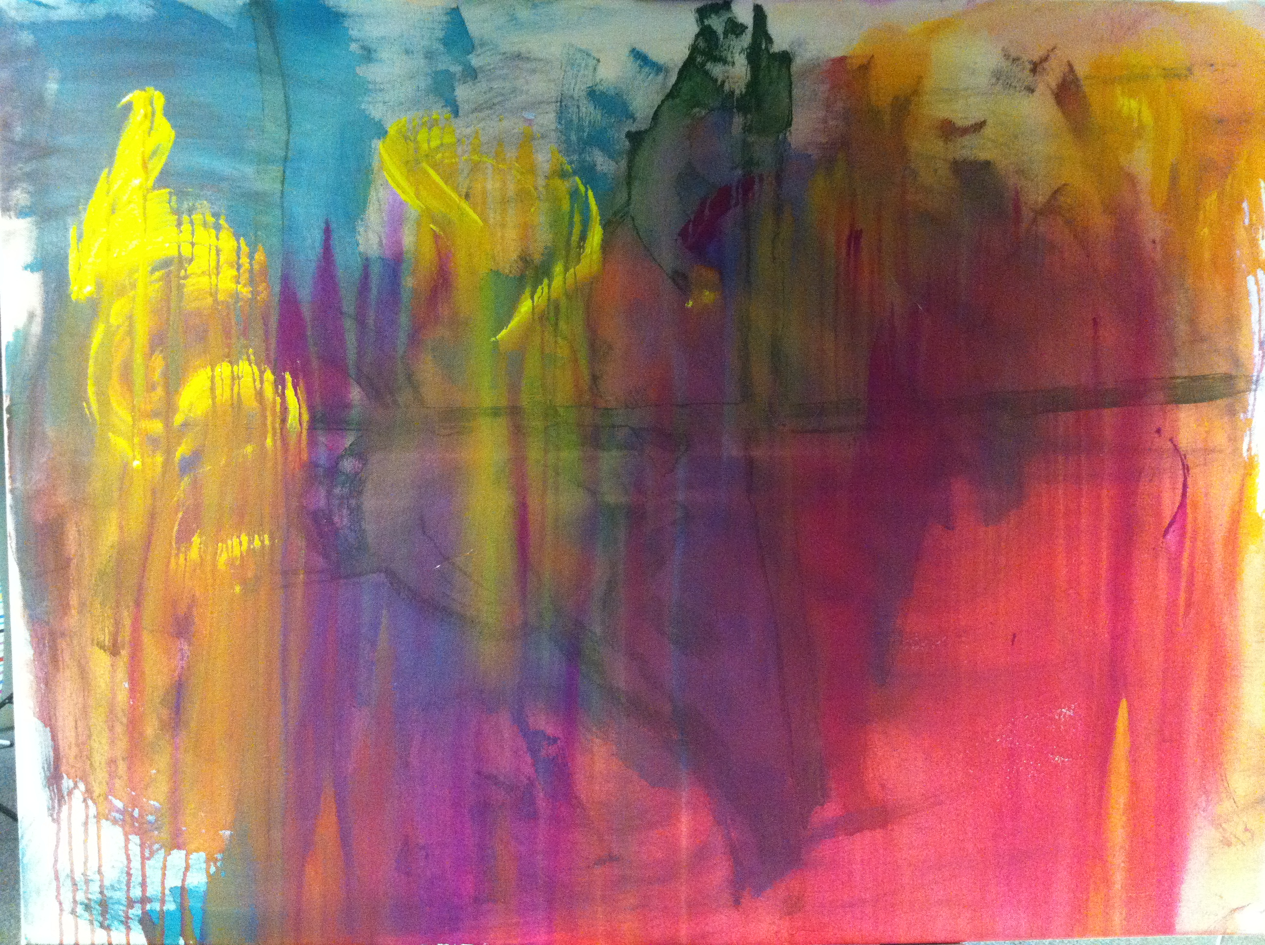 I tried some things at the studio over the weekend and started with a canvas which had already some marks on it from a previous experiment, long wiped off and painted over. Then using the new brush loaded with colour and excitement I started.